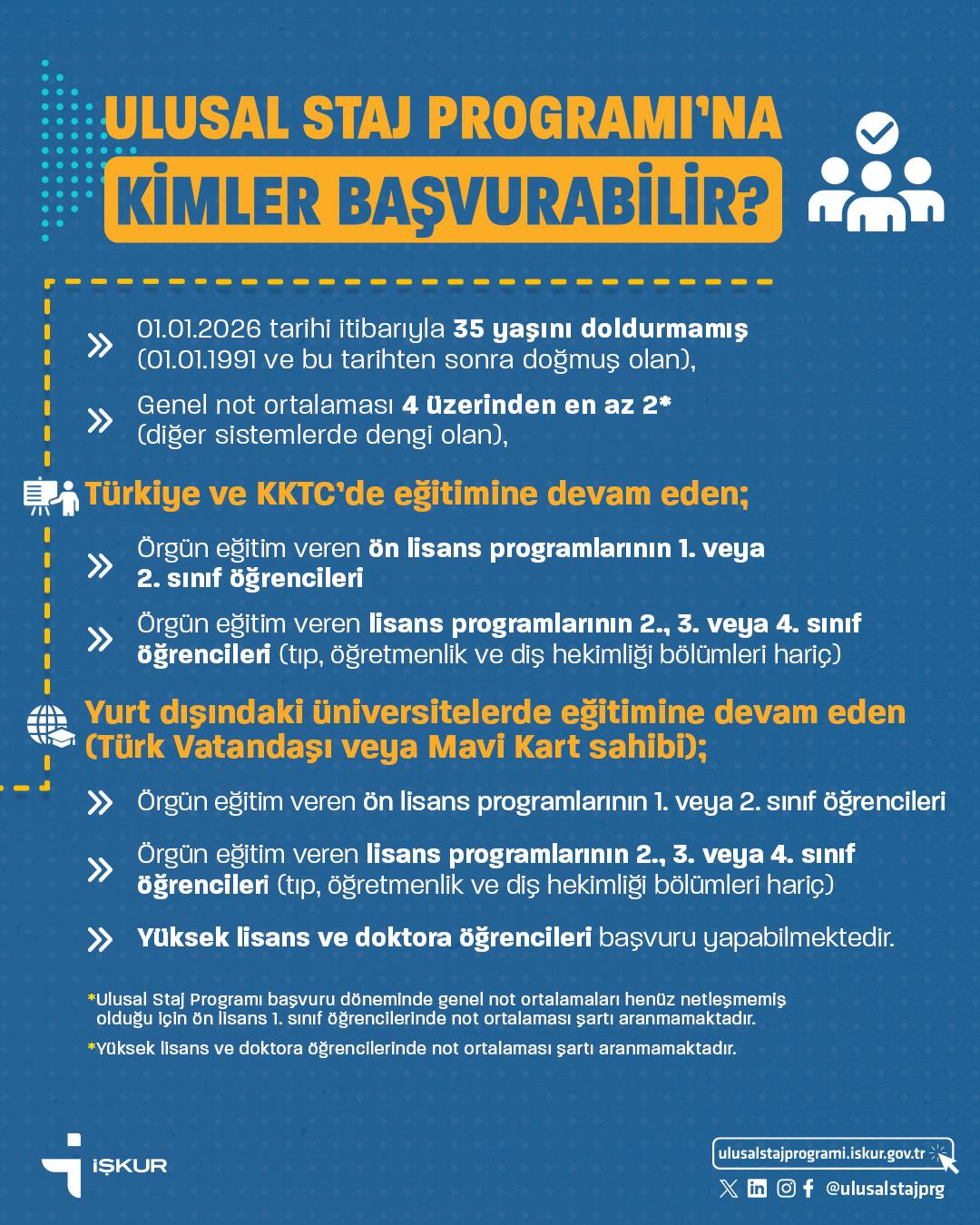 Başvurular için; https://ulusalstajprogrami.iskur.gov.tr